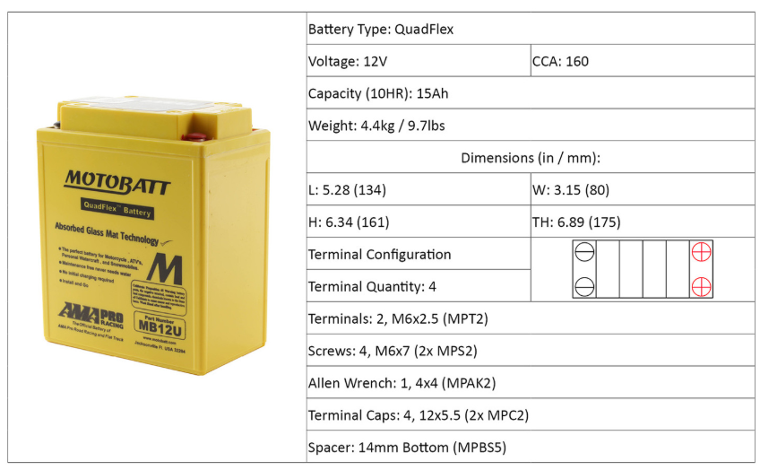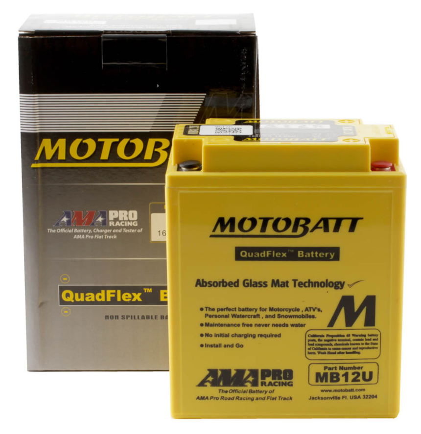 Motobatt batteries are manufactured from Absorbed Glass Mat (AGM), this design has revolutionised the motorcycle, ATV, lawnmower and small engine industry. QuadFlex provides a unique four-terminal design with two positives, two negatives along with height spacers that permit an almost universal fit. All Motobatt AGM Batteries are maintenance-free, non-hazardous, non-spill, charged and ready to install directly out of the box.