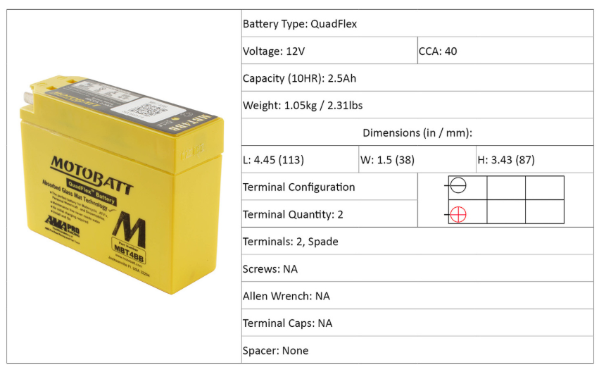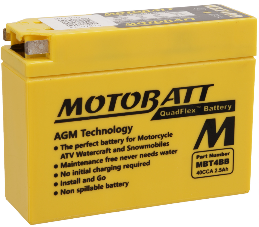 Motobatt batteries are manufactured from Absorbed Glass Mat (AGM), this design has revolutionised the motorcycle, ATV, lawnmower and small engine industry. QuadFlex provides a unique four-terminal design with two positives, two negatives along with height spacers that permit an almost universal fit. All Motobatt AGM Batteries are maintenance-free, non-hazardous, non-spill, charged and ready to install directly out of the box.