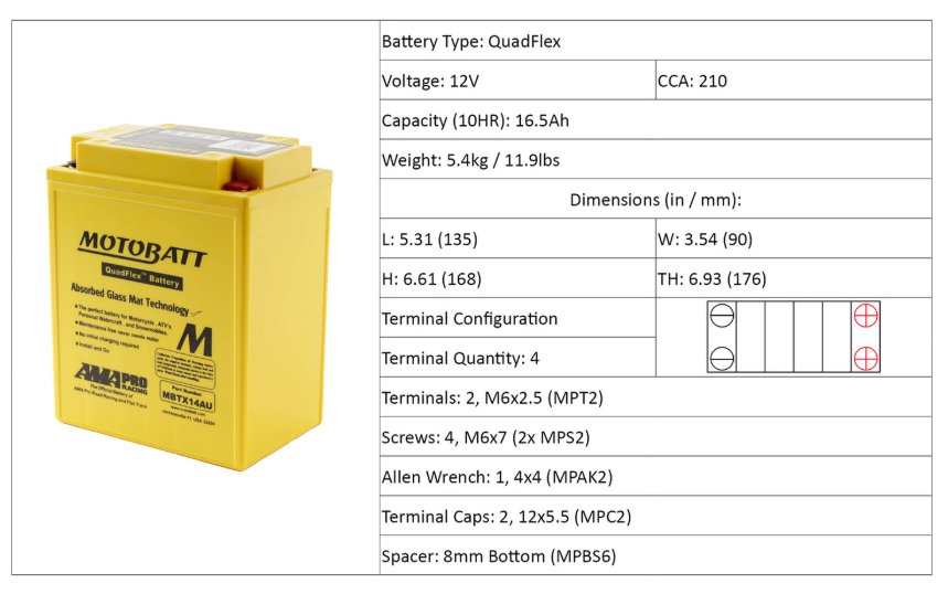 Motobatt batteries are manufactured from Absorbed Glass Mat (AGM), this design has revolutionised the motorcycle, ATV, lawnmower and small engine industry. QuadFlex provides a unique four-terminal design with two positives, two negatives along with height spacers that permit an almost universal fit. All Motobatt AGM Batteries are maintenance-free, non-hazardous, non-spill, charged and ready to install directly out of the box.