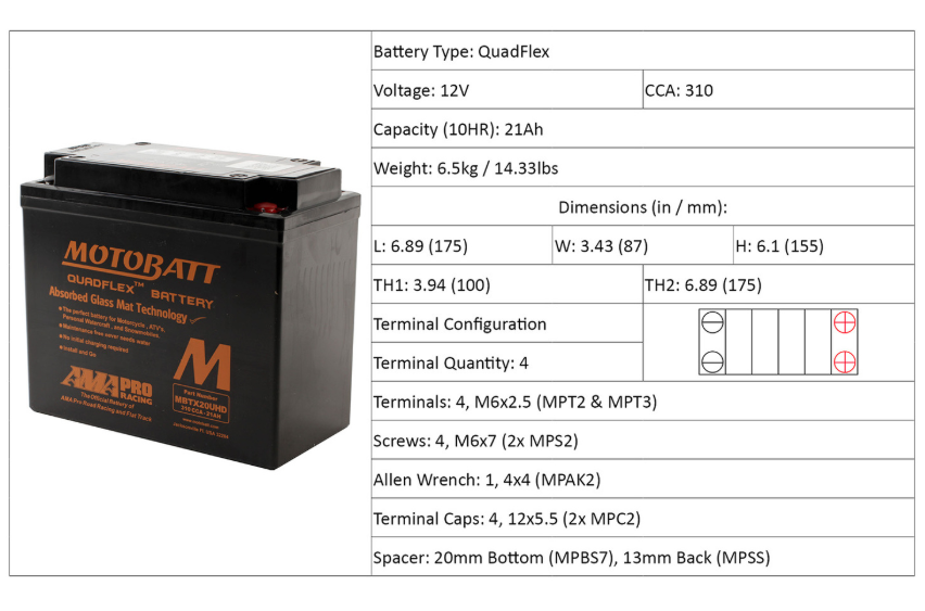 Motobatt batteries are manufactured from Absorbed Glass Mat (AGM), this design has revolutionised the motorcycle, ATV, lawnmower and small engine industry. QuadFlex provides a unique four-terminal design with two positives, two negatives along with height spacers that permit an almost universal fit. All Motobatt AGM Batteries are maintenance-free, non-hazardous, non-spill, charged and ready to install directly out of the box.