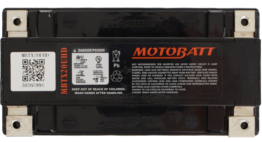 Your Motobatt is a Factory Activated battery, it comes to you pre- conditioned and fully charged for optimum performance and ready to install out of the box. 80% of early Powersports battery failure is caused by faulty activation of the dry battery plates. Additionally, you never have to mess with acid or top up fluid levels or remove corrosion from the terminals caused by gassing, which are all common with standard flooded battery types.
