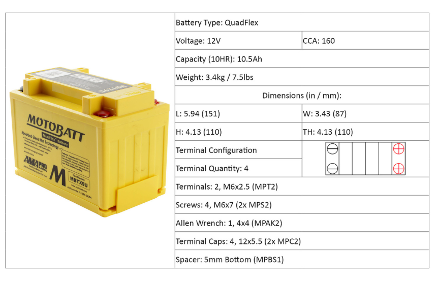 Motobatt batteries are manufactured from Absorbed Glass Mat (AGM), this design has revolutionised the motorcycle, ATV, lawnmower and small engine industry. QuadFlex provides a unique four-terminal design with two positives, two negatives along with height spacers that permit an almost universal fit. All Motobatt AGM Batteries are maintenance-free, non-hazardous, non-spill, charged and ready to install directly out of the box.